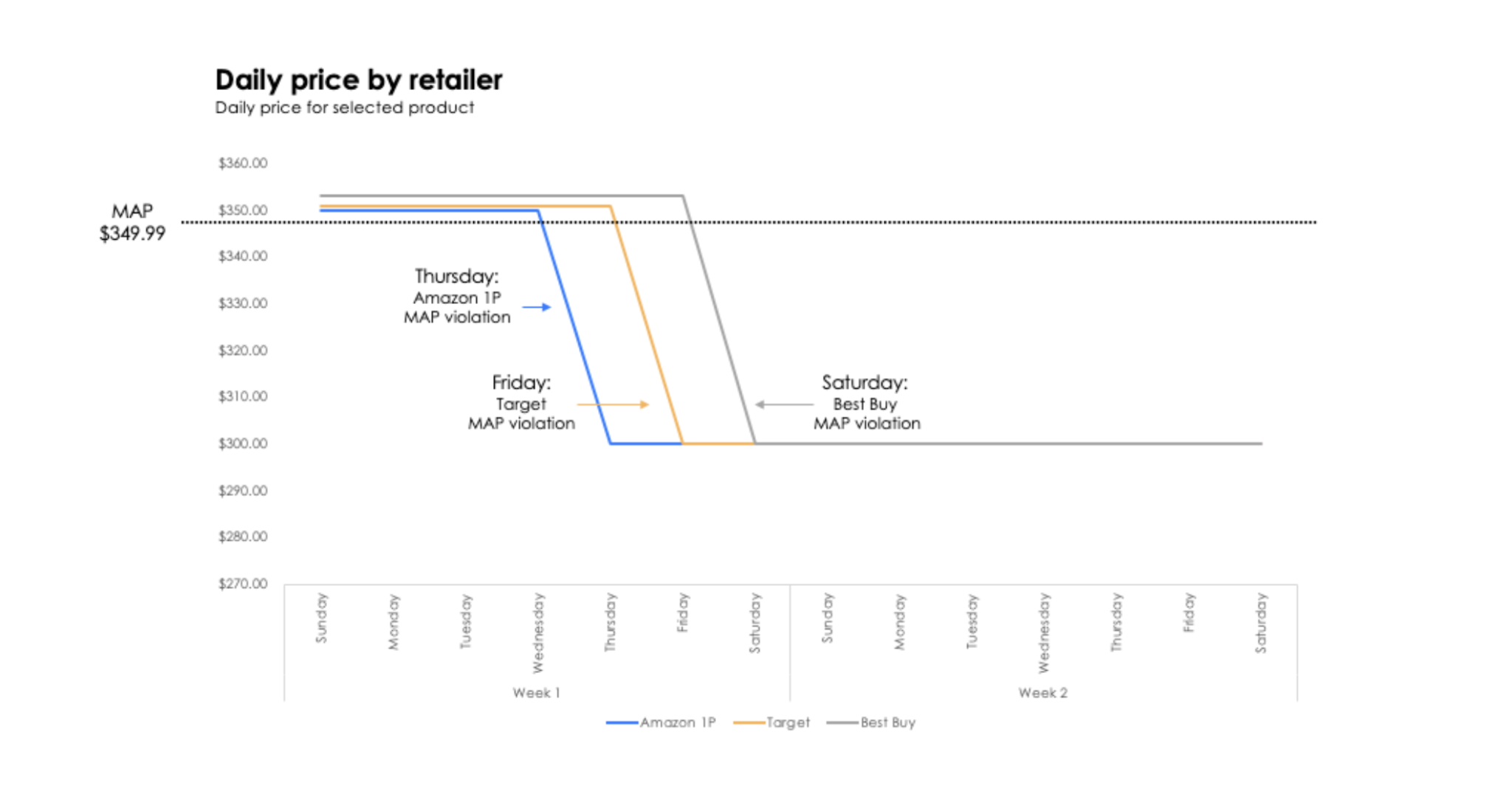 In this example, a MAP violation occurred on Thursday and started a domino effect of retailers lowering their prices below the floor mark. Rather than waiting a week to receive the information in order to rectify it (or missing the violation entirely), the brand was able to receive proof of which retailers were responsible and react the day it happened. When a price drops below the minimum price, this can set off a chain reaction that negatively impacts your brand integrity. With daily round-the-clock pricing detection, you respond quickly with credible proof to send to violators.